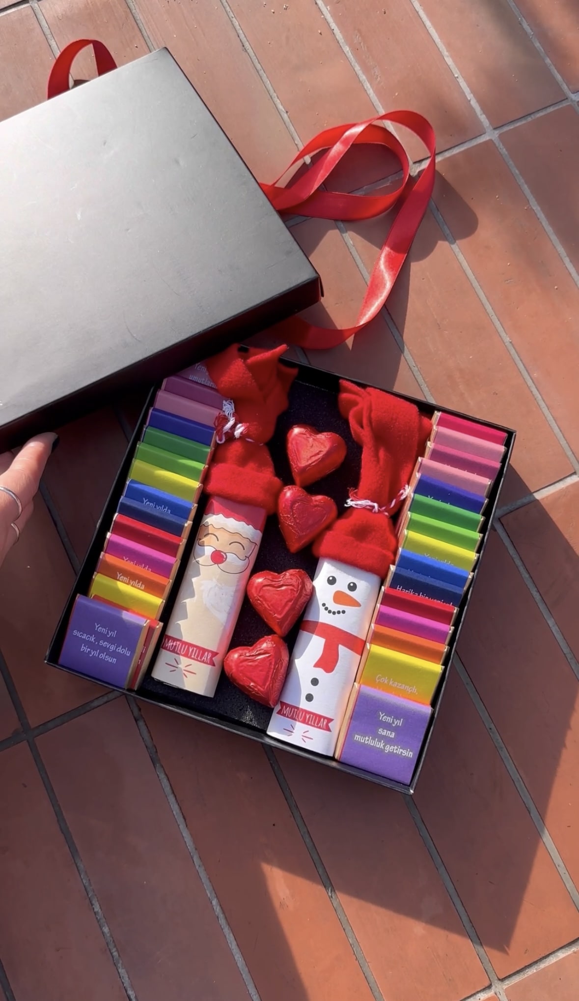 Yeni yılın ruhuna yakışır kırmızı – siyah kutusunda tasarlanmış olan bu özel kutu; 32 adet marka ve lezzetli sütlü çikolata ihtiva ediyor. Ve bir adet de yeni yılı en güzel şekilde tasvir eden şapkalı kardan adam çikolatası da mevcut. İçinde bulunan asılabilen noel baba ve kozalak gibi yeni yıl süsleri de cabası.