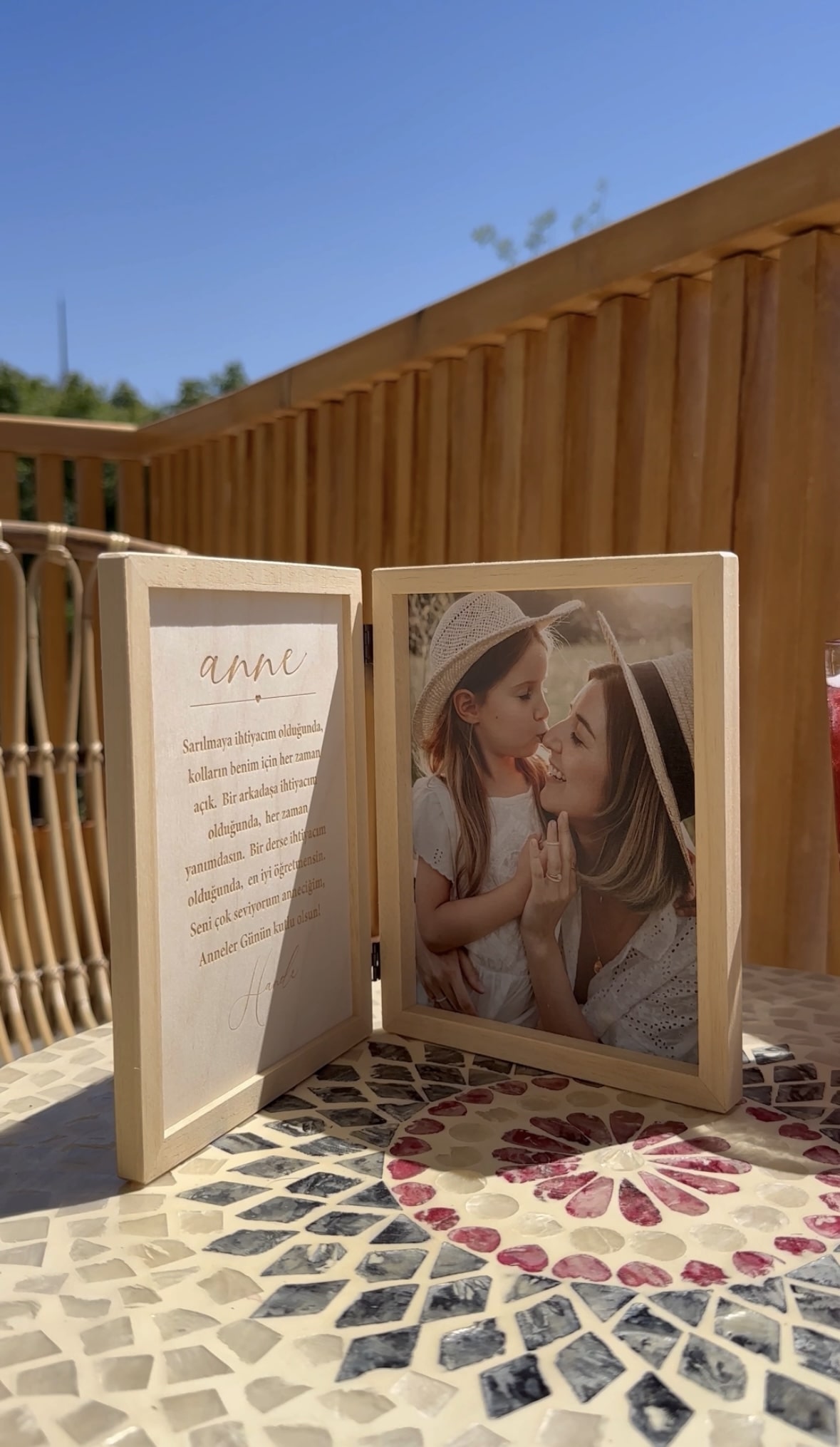 Anneler Günü Hediyesi Ahşap Çerçeve - Fotoğraflı Ahşap Hediye Kutusu hem açık, hem de kapalı bir biçimde kullanılabilecek olan ve el yapımı ahşap yapısıyla dikkat çekmeyi başaran özel hediyeler arasında yer alır. Anneler gününün yanında, doğum günleri için de özel bir anı yaratmak hedeflerinizi gerçekleştirmek için değerlendirebileceğiniz özel ürün, 2 parçadan oluşmaktadır. Bir tarafta, dilediğiniz ve baskılanmasını istediğiniz fotoğrafınızı seçerek ahşap içerisine bu özel hatıranızın işlenmesini sağlayabilirsiniz. Kutunun diğer tarafına ise son derece özel bir biçimde dilediğiniz mesaj ve dileklerinizin yazılmasını sağlayabilirsiniz.