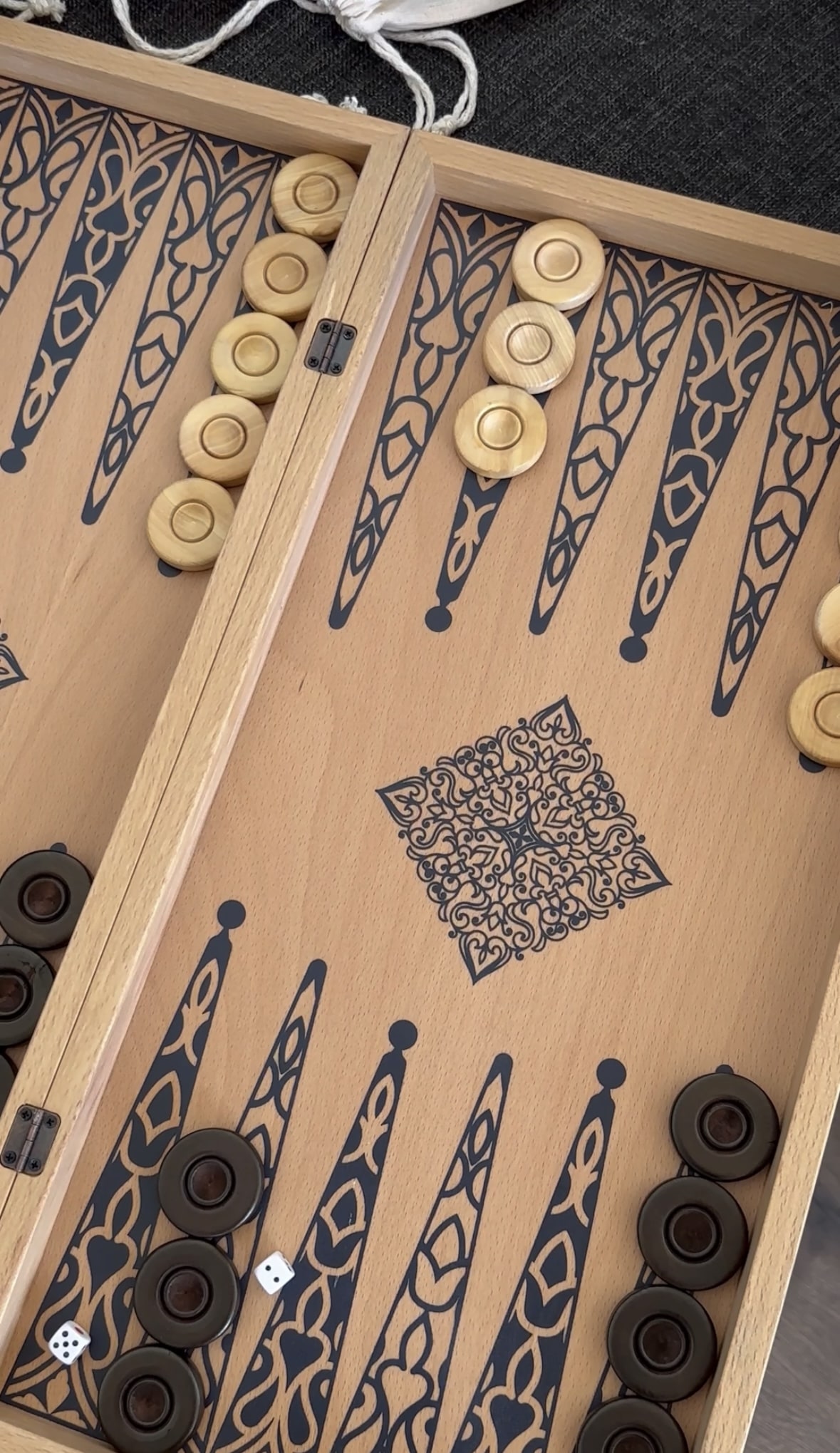 Tavlanın iç kısmında bulunan desenler, oyuna ayrı bir şıklık katarken, kaliteli işçiliği ile uzun yıllar boyunca kullanıma dayanıklıdır. Taşları ve zarları ile birlikte eksiksiz bir set olan bu tavla, babanızın oyun keyfini ikiye katlayacak. Ayrıca, taşların ve zarların saklanması için özel bir kesesi de bulunmaktadır.
