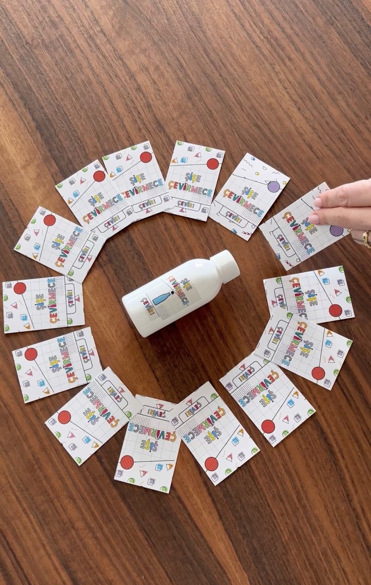 - Kartlar görseldeki gibi dizilerek bir çember oluşturulur.Şişe çemberin orta noktasına gelecek şekilde yerleştirilir.Oyuncular şişeyi sırayla çeviriler.Şişe dönüp durduğunda,şişenin gösterdiği soru ya da görev kartı seçilir.Kartlarda 4 farklı renk ve puanlama sistemi vardır.Oyuncular seçilen karttaki görevi tamamlarsa artı, tamamlamazsa eksi puan alır.En yüksek puanı alan kişi oyunun kazananı olur.