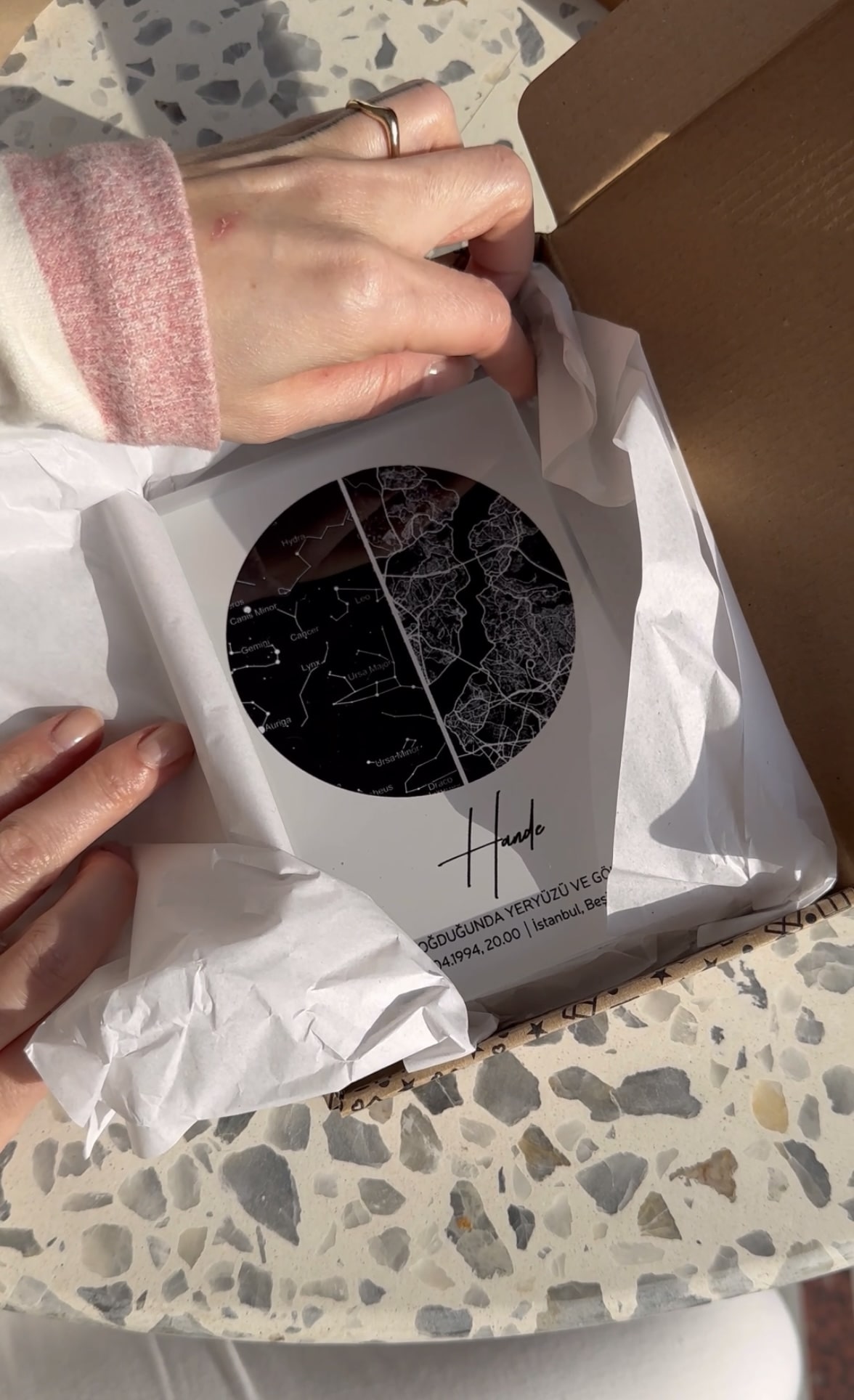 Kişiye Özel Gökyüzü ve Yeryüzü Harita Tasarımlı Akrilik Çerçeve, dekoratif olarak her ortamın havasını değiştirebilecek orijinal tasarımlı ürünler arasında yer almaktadır. Bunun yanında, oldukça farklı bir saydam tasarıma sahip olmasını sağlayan akrilik yapısıyla birlikte, uzun süre renklerini ve yapısını korumayı başaran dayanıklı aksesuarlar arasında yer almayı da başarmaktadır. Sevgililer günü veya yıl dönümü için de sıklıkla tercih edilen hediyeler arasında yer alan özel akrilik çerçeve, tanışma anınız, konumunuz ve tarihiniz ile özelleştirilerek sizler için gökyüzü haritası ve şehir haritası ile özelleştirilerek üretilmektedir.