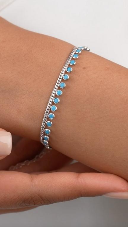 Bu muhteşem bileklik, en kaliteli gümüş malzemeden üretilmiştir ve üzerindeki mavi zirkon taşlar ile dikkatleri üzerine çekmektedir. Kadınlara özel tasarlanmış olan Figaro zinciri de bilekliğe ayrı bir hava katmaktadır. Bilekliğin figaro yapısı, her türlü kıyafetle mükemmel uyum sağlar ve her an kullanıma uygundur.